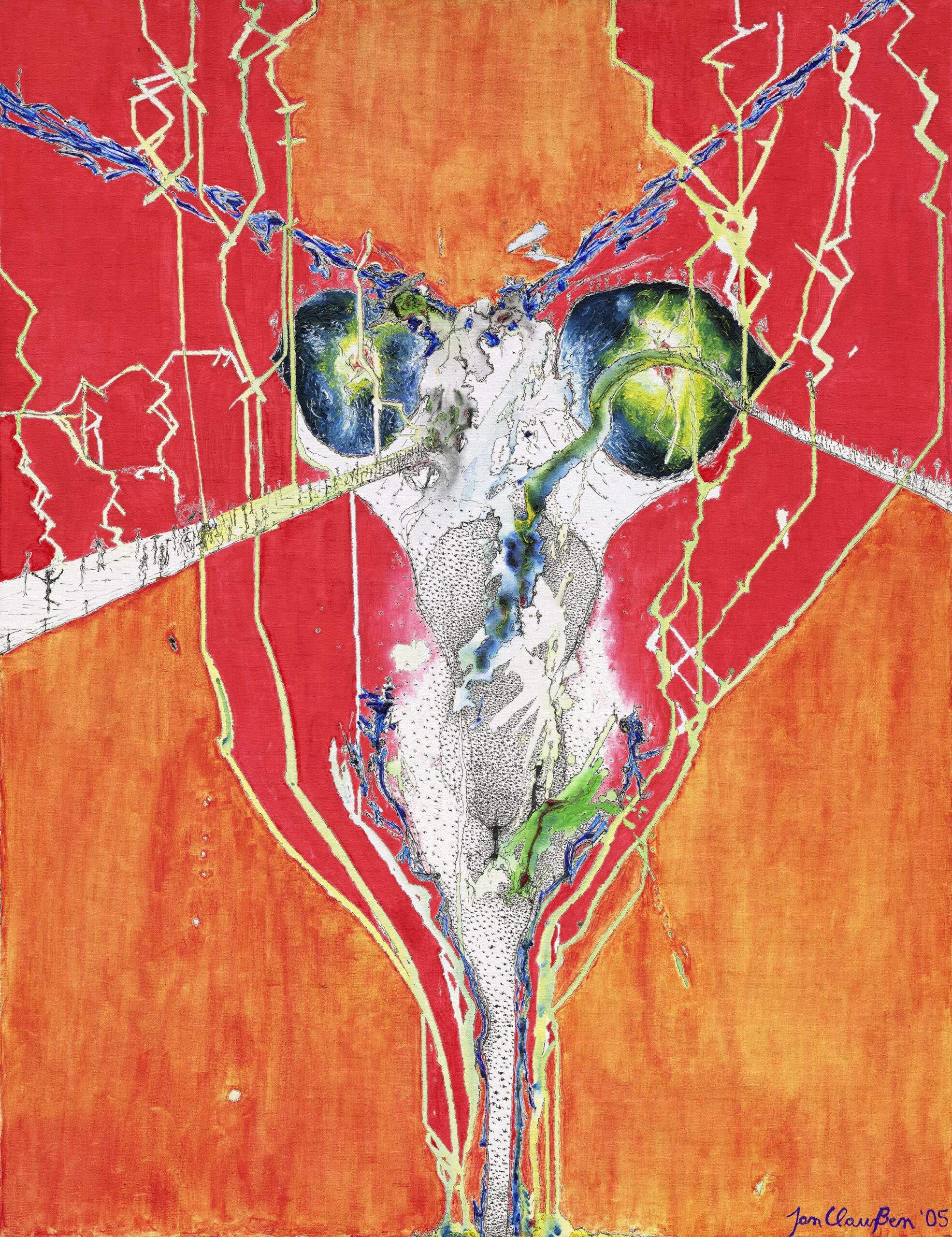 "Alles durchdrungen von Teilchen, Lichtteilchen, Elementarteilchen, und inmitten des Blau schwingen die Teilchen mit Eigenfrequenz auf Bahn gebracht mit richtungsgebenden Bewegungen, physikalisch beschrieben, durch menschgemachte Worte wie Sinus und Cosinus, definiert durch Zahlen und Zeichen, hineingeschrieben in unzählige Bücher, in jeder Sprache, jeder Kultur, rund um den Globus. Hinausgeschickt in die unendlichen Weiten des Universums. Wellen, die sich ausbreiten, überlagern, auslöschen, je nachdem. Erfahrbar, erlebbar, spürbar. Dr. J. Claußen bringt die Bewegungen auf die Leinwand und macht das Unsichtbare sichtbar." CRELALA